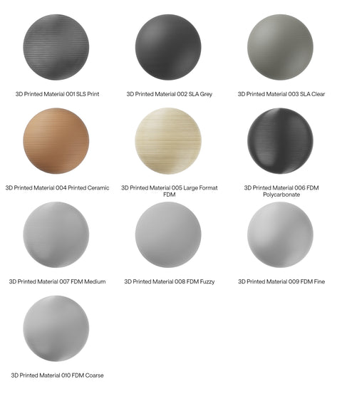 This package contains a KeyShot Material Package (.kmp) file for 10 3D printed materials, ranging from fine SLA and FDM to large format ceramic. These are driven with a mix of custom-made PBR and procedural textures.
