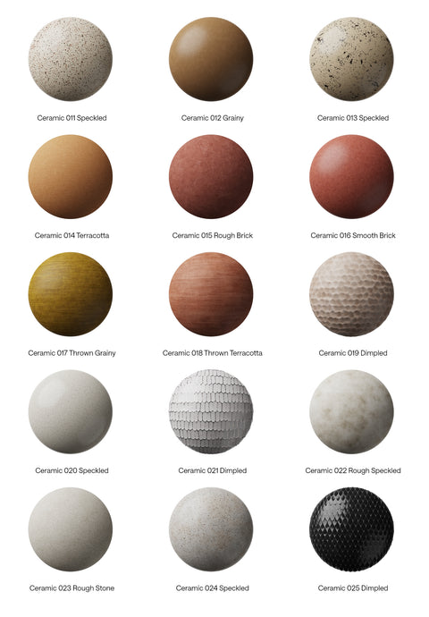 This package contains 15 ceramic materials, including speckled, smooth, rough, brick and dimpled variations.