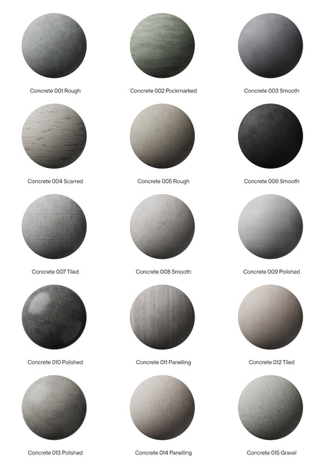 This package contains 15 concrete materials, ranging from rough, smooth, polished, tiled and panelling, ready to drag and drop on to your scenes.