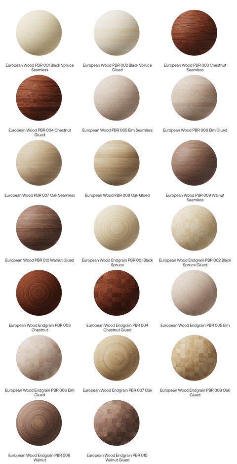 This package contains 20 European wood materials using PBR image textures to create seamless and glued versions of black spruce, chestnut, elm, oak and walnut, each with two endgrain materials.