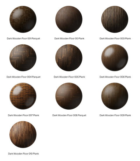 This package contains a KeyShot Material Package (.kmp) files for 10 dark wood floors, ready to drag and drop on to your scenes. The materials vary from rough wood planks to pristine, polished tiles, and are all made in 4K and are set up for photo-realistic results and quick application.