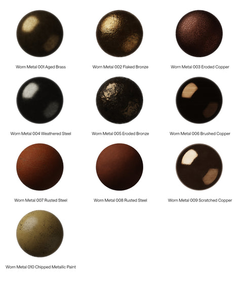 This package contains 10 worn metal materials, from subtle aged brass to completely rusted steel, ready to drag and drop on to your scenes.